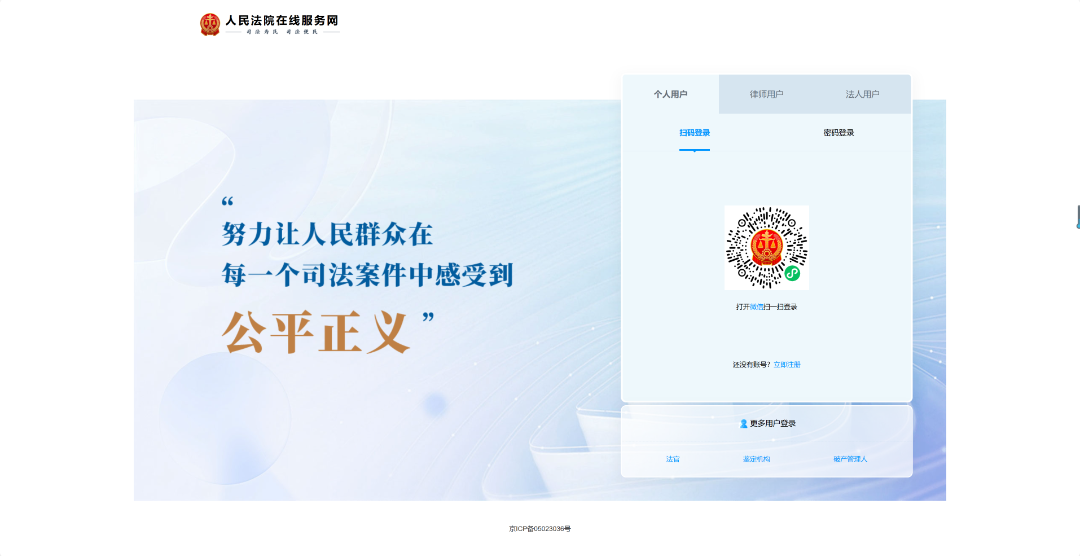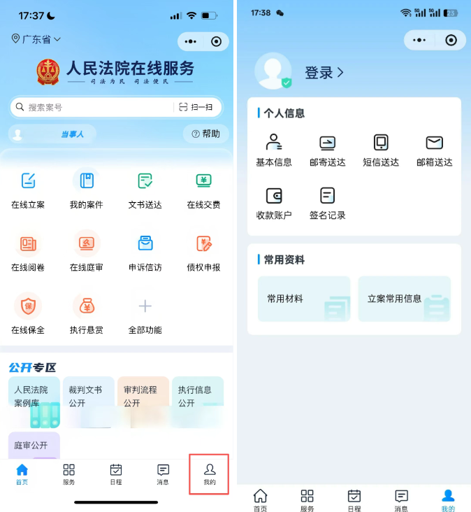 二、小程序端 2.1账号登录与首页 在微信中搜索人民法院在线服务全国版,进入小程序,点击“首页”或者“我的”中的“注册”按钮,跳转到注册页面完成登录。