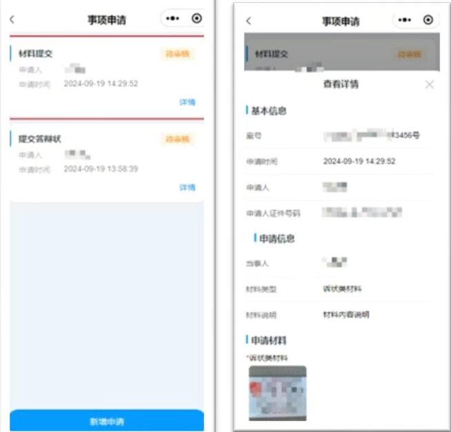 提交材料后,可以在“申请记录”中查看到提交的记录,点击“详情”可以查看具体内容。提交的材料会进入法院审判系统,法官可以查看到对应材料。