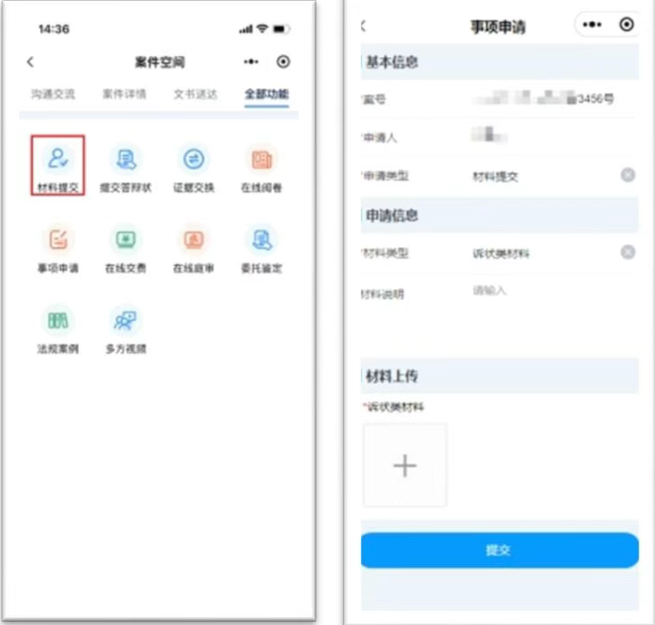 2.2案件空间提交材料 在“我的案件”列表“全部功能”页签找到“材料提交”,编辑材料提交信息,上传提交的材料附件。