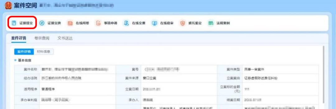 1.2在线材料提交和证据交换 进入“案件空间”,点击上方快捷菜单中的“证据提交”。