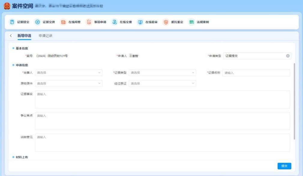 在出现的“新增申请”页面中,按要求填写证据信息和要提交的证据材料。在“申请记录”中可以查看历次申请的信息。