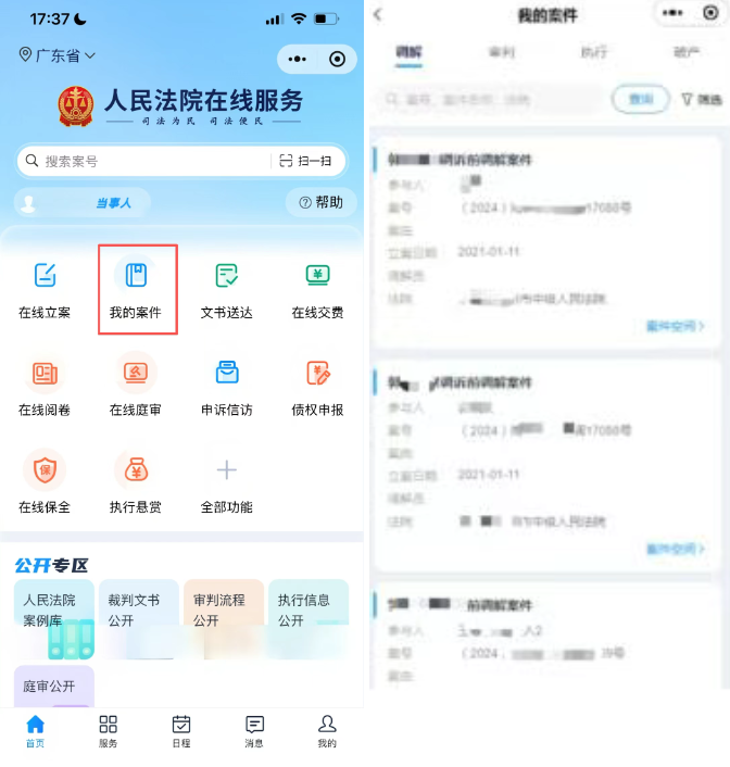 登录后跳转到当事人门户页面,底部菜单栏包含首页、服务、日程、消息和我的5大功能模块,默认显示【首页】,进入【我的案件】查看与我相关的案件及案件办理进展。点击【案件空间】按钮,跳转至案件空间页面。