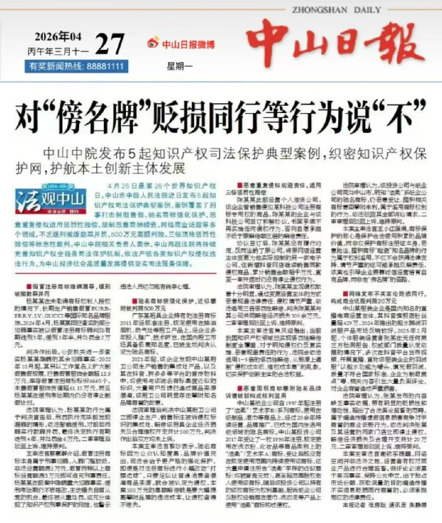 2026年4月26日是第26个世界知识产权日。中山市中级人民法院近日发布5起知识产权司法保护典型案例,案例覆盖了刑事打击制假售假、驰名商标强化保护、恶意重复侵权适用惩罚性赔偿、规制恶意商标碰瓷、网络商业诋毁等多个领域,不乏缓刑撤缓数罪并罚、500万元高额判赔、三倍顶格惩罚性赔偿等标志性裁判。中山中院相关负责人表示,中山两级法院将持续完善知识产权全链条司法保护机制,依法严惩各类知识产权侵权违法行为,为中山经济社会高质量发展提供坚实司法服务保障。