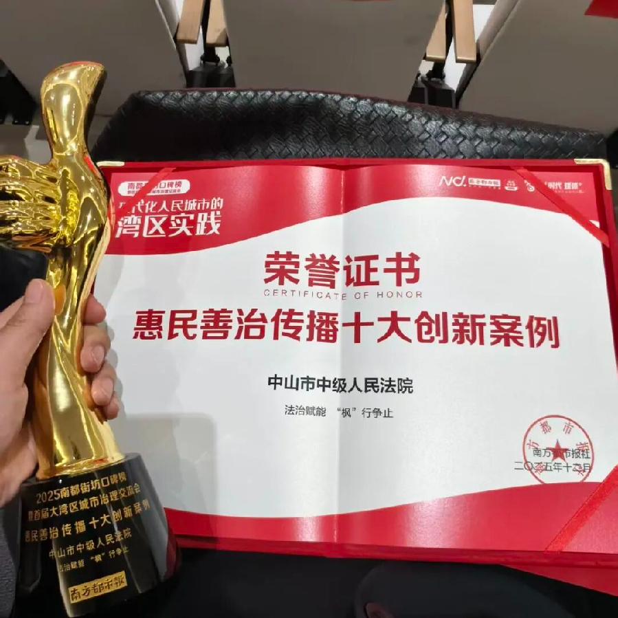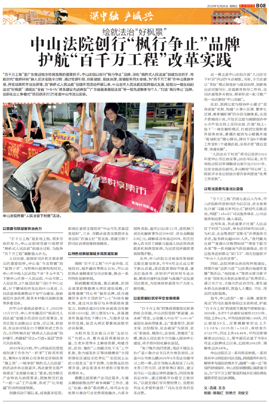 百千万工程”是广东推进城乡协调发展的重要抓手。中山法院以创行“枫行争止”品牌、深化“枫桥式人民法庭”创建为总抓手,将新时代“枫桥经验”融入司法实践全过程,通过党建引领、创新赋能、前端治理、温情服务四大举措,为“百千万工程”在中山落地生根、开花结果筑牢法治屏障。自“枫桥式人民法庭”创建示范活动开展以来,中山全市人民法庭实现跨越式发展,绘就出一幅生动的法治“好枫景”:涌现出“全省‘1+6+N’体系建设先进典型”“广东省最美基层法官”等一批先进集体与个人,“打造‘枫行争止’品牌,创新化讼止争模式”项目获评2025年度中山市法治实事。