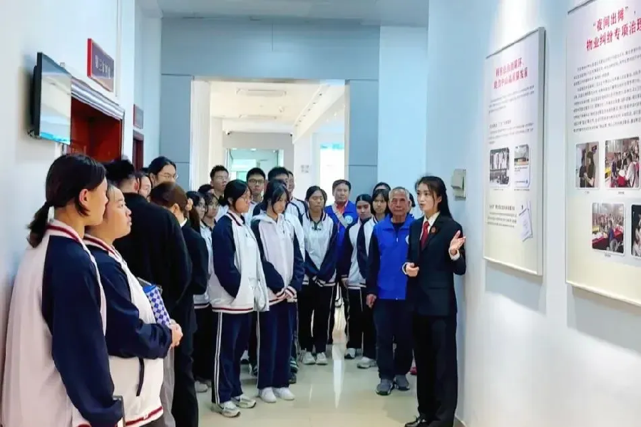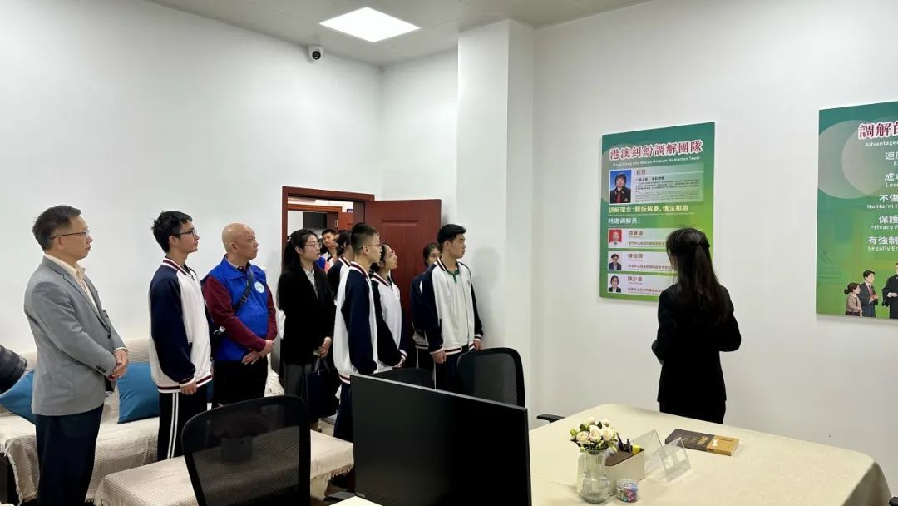 ▲参观同心圆调解室 “我们现在来到了‘同心调解室’,这是全国首创的‘粤港澳同心桥’解纷机制,法庭专门聘请港澳同乡会的会长、副会长担任港澳纠纷调解团队的特邀调解员,促进涉港澳纠纷的多元化解、前端化解。”