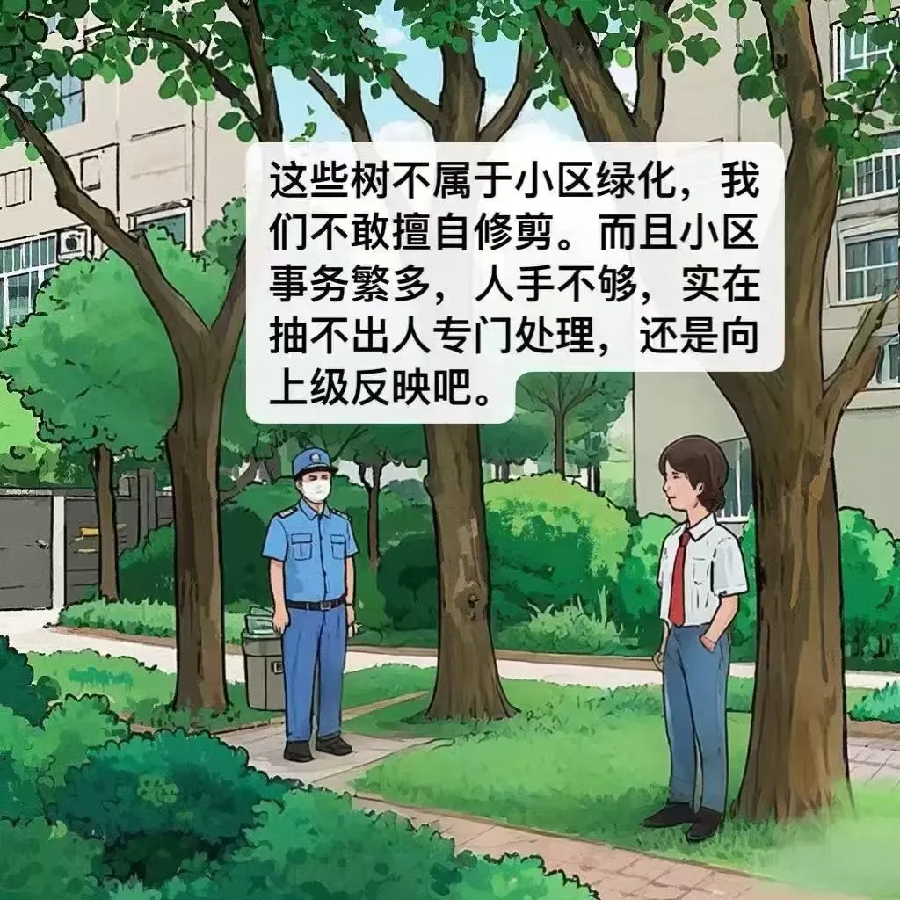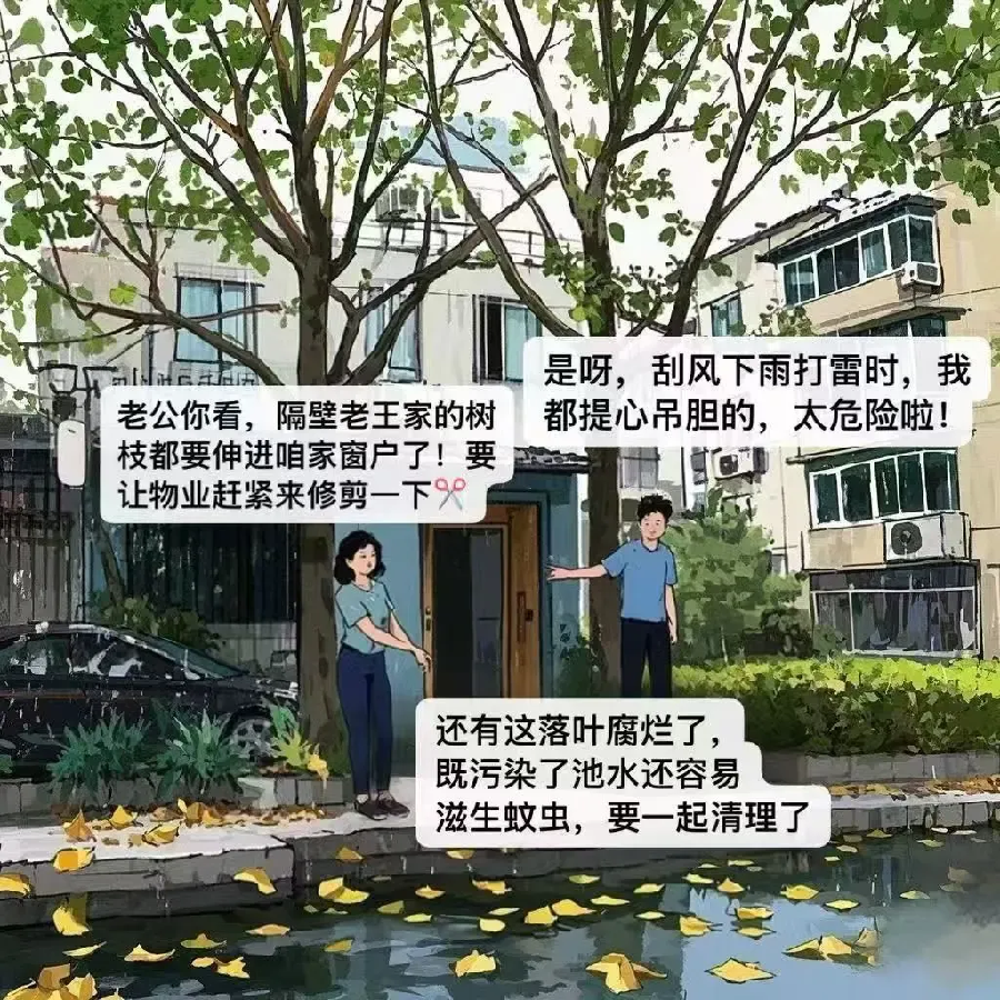 尚女士夫妇多年前购入三乡镇某小区的独栋别墅,与物业公司签订前期物业服务协议,其中明确约定业主的物业若存安全隐患危及公共及他人利益,业主应及时维修养护,否则物业公司有权处理。收楼后,尚女士依约缴纳物业费,前期1.8元每月每平方米,后期2.5元每月每平方米,一直交到2022年6月30日。平静生活突生变故,尚女士发现相邻独栋别墅院落里的三棵小叶榄仁树疯长。走进自家院子,只见树枝肆意伸展,有的甚至顶到了窗户,随时可能打破玻璃。地上满是厚厚的落叶,腐臭气味弥漫。公共水系也被落叶和杂物堵塞,水流迟缓,水面漂浮着绿藻和垃圾,散发出阵阵恶臭,蚊虫滋生,嗡嗡乱飞。