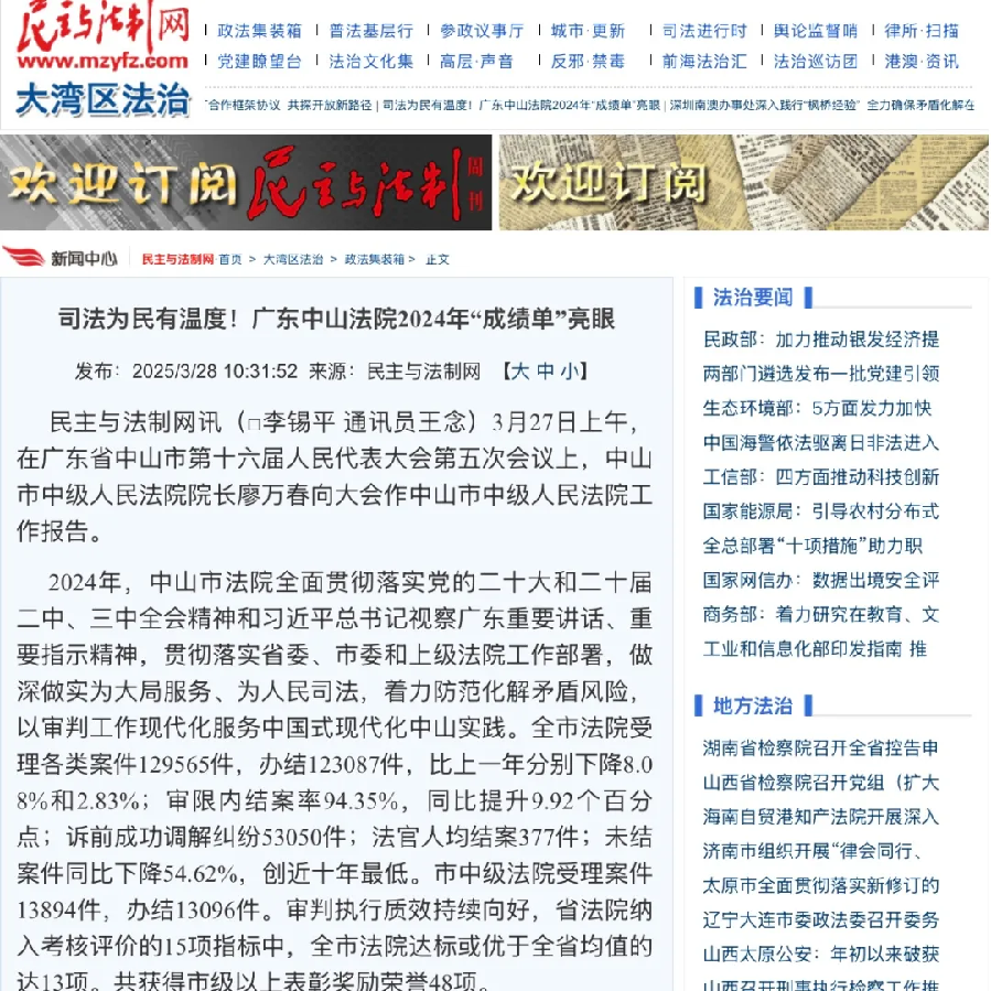 《新快报》 中山法院通过加强民生权益司法保障、强化人权司法保障、依法兑现胜诉权益、提供高品质诉讼服务等一系列措施,切实提升司法为民水平。在婚姻家庭、劳动就业、教育医疗等民生领域,全市法院去年妥善处理1.3万余件“家长里短”的民生案件。 《中山新闻》 (视频) 中山法院服务保障大湾区建设,聚焦大湾区“一点两地”定位,深化涉港澳专窗诉讼服务,完善跨境商事纠纷多元化解机制,创建涉外涉侨多元解纷品牌,深化大湾区区域司法合作,加强粤港澳司法文化交流,接待来中山体验内地法治的港澳学生210人次,“香山融+”文化交流融合品牌入选广东法院服务保障粤港澳大湾区建设创新事例。