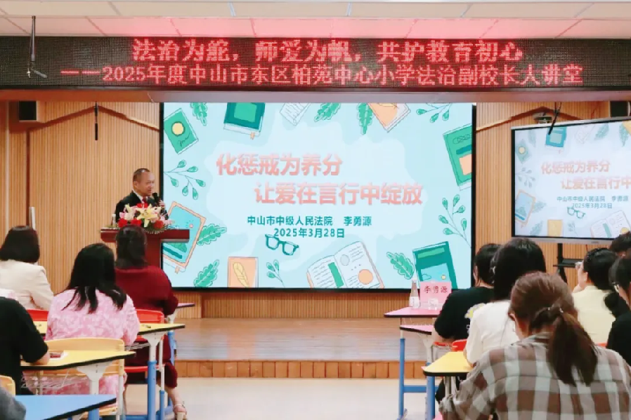 三月的风掠过法徽,捎来木棉的絮语,中山两级法院的法官们褪下法袍、走出法庭,将一堂堂生动的法治课搬进了书香氤氲的校园。 市中级法院 在东区柏苑中心小学,中山市中级人民法院审判监督庭庭长李勇源法官作为法治副校长为学校全体教师开讲“法治为舵,师爱为帆,共护教育初心”的专题法律讲座,李法官强调,在孩子成长的画卷上,爱始终是不变的底色,惩戒既要画出边界的线条,也留出绽放的空白,孩子才能身心健康成长。
