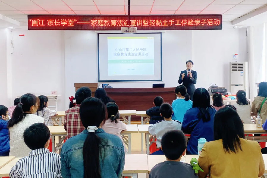 在黄圃镇党群服务中心,市第二法院黄圃法庭黄燕芳法官为现场20组家庭带来了一场别开生面的家庭教育法治讲座。黄法官围绕《中华人民共和国家庭教育促进法》深入剖析了家庭教育中的法律责任与义务,点明家长在孩子成长过程中不仅肩负着抚养重任,更承担着依法教育、引导的法定职责,并督促家长积极履行教育责任,做到“依法带娃”,为孩子营造健康的成长环境。