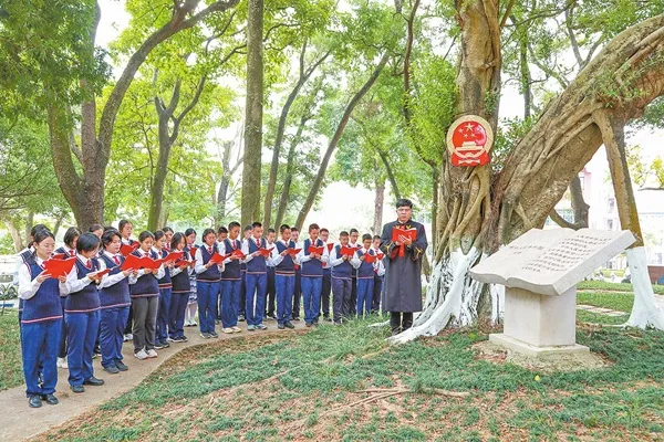 我们不再只是‘讲法条’,而是让学生‘看、演、悟’。”贝奇聪介绍。在法院庄严肃穆的审判庭里,同学们“沉浸式”旁听庭审;在火炬开发区红领巾培育基地,同学们自编自导“学生欺凌案”模拟法庭。在中山纪念中学,同学们和法官一同在国徽下诵读宪法。