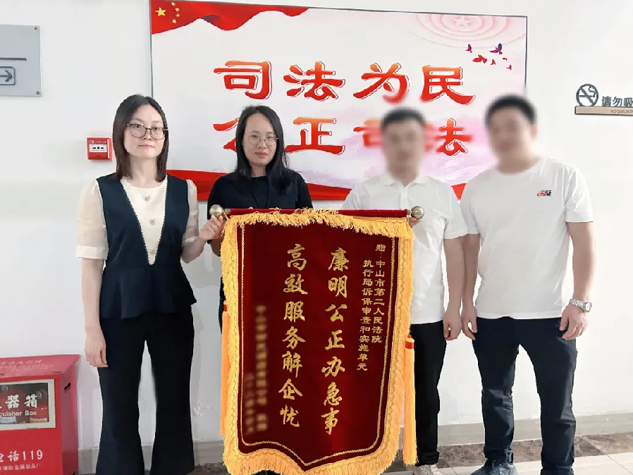 锦旗×3! 近日,市第二法院连续收到群众送来的三面锦旗,一起来看看锦旗背后的故事。 涉及21万元存款,仅2天迅速化解纠纷 “如果没有及时完成解封,我们公司运营就很困难了,感谢法院的快速高效!”中山某酒店公司(化名)负责人将一面写有“廉明公正办急事,高效服务解企忧”的锦旗送到市第二法院诉讼保全团队手上,为他们的高效、快速办案表示感谢。
