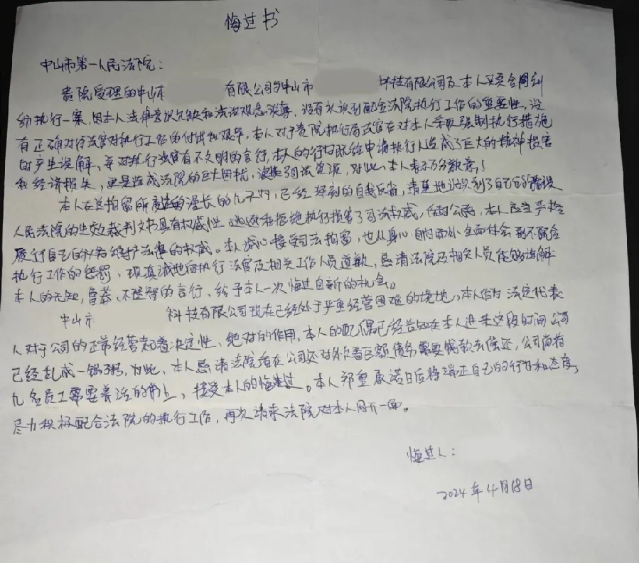 由于厂里还有数名员工,考虑到直接拘留会引起仍在工作的员工焦躁恐慌,执行干警并没有采取现场拘留的措施,而是要求刘某到法院进一步说明情况。 来到法院后,执行法官耐心对刘某释法说理,但刘某仍然没有一点和谈的诚意,坚持声称自己没有还款能力,甚至质疑法院的文书。在多次劝说无果后,为震慑拒不履行义务的被执行人,高丽法官果断决定对其采取司法拘留措施。 法警为刘某戴上手铐并通知其家属后,刘某开始慌了,表示愿意筹钱还款。同时接到通知的刘某家属也开始筹钱,并在送拘后的3个小时内,刘某家属向申请人还清全部欠款。 “我已意识到自己的错误,司法权威不可挑战,我会全力配合法院工作……”刘某在看守所内写下了悔过书。