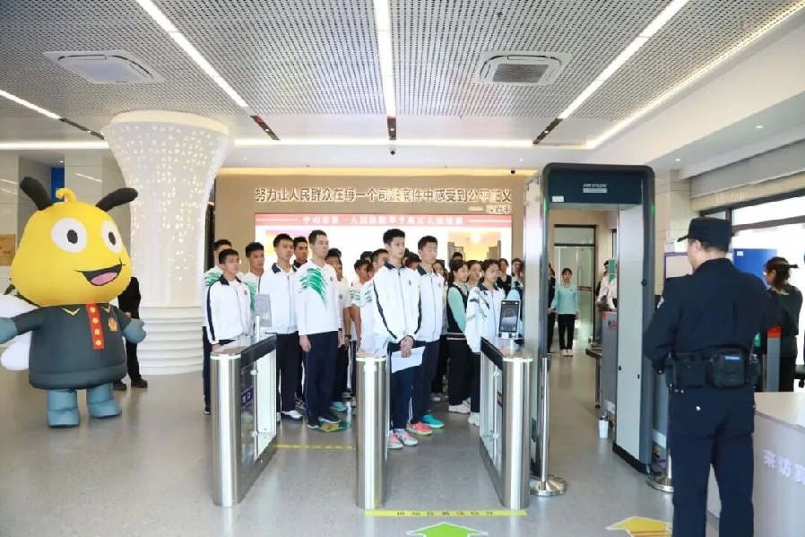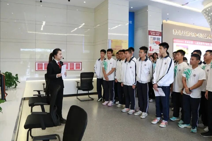 ▲在“法治体验官”角色中感受司法温度,在模拟法庭中体会司法威严。 在毗邻深中通道的翠亨新区人民法庭,62名来自中山纪念中学港澳班的学生作为“法治体验官”,走进这个刚成立不久、服务粤港澳深度融合的法庭。从安检体验到“要素式起诉状”讲解,从模拟调解到法袍试穿、宪法诵读,学生们沉浸式体验湾区特色法庭的工作流程与文化氛围。