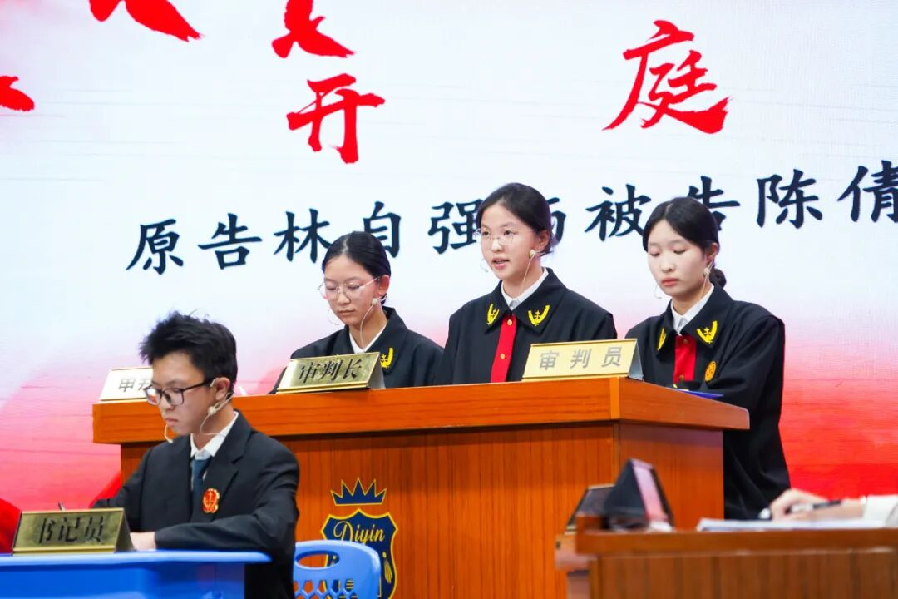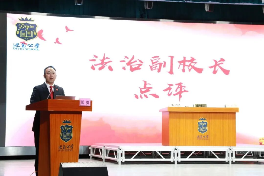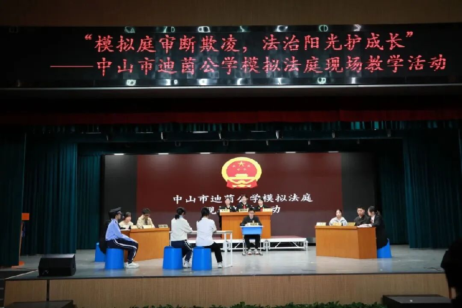 在迪茵公学的模拟法庭活动中,学生们通过演绎学生欺凌案例,亲身体验庭审程序。 中山市第一人民法院行政庭庭长、学校法治副校长匡勇在点评中结合粤港澳三地法律实践,强调“法治是湾区青年的共同语言”,并为学生赠送宪法读本,鼓励他们成为法治文化的传播者。