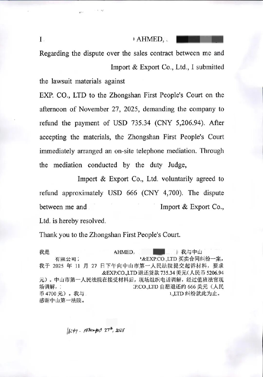 起因:一笔货款起争议,沟通无果陷僵局 今年9月,在浙江经商的阿麦德通过微信与中山某进出口公司销售经理谢先生达成采购意向,并于10月正式签订总价29438.55美元的合同,阿麦德依约支付了全款。 然而,在合同履行过程中,双方因产品及出口包装问题产生分歧,最终决定解除合约。中山某公司先行退还了大部分货款,但剩余735.34美元应否退还、如何计算,双方始终无法达成一致。 阿麦德认为,因产品无法交付,货款应全额退还。中山某公司则主张产品均可交付,是对方要求的包装不符合报关要求导致解约,因此需扣除部分成本,余款不予退还。多次协商未果后,双方陷入僵局。 解纷:走进法院求帮助,法官现场促调解 随后,阿麦德在朋友建议下,来到中山法院诉讼服务中心。现场导诉员和窗口工作人员引导阿麦德的朋友协助填写要素式起诉状,并准备诉讼材料。值班法官高昊振与阿麦德现场交流,了解案件情况。在得知案件标的额不大且双方争议明确后,高昊振法官征得阿麦德同意,现场与中山某公司的谢先生电话联系,争取在前端化解矛盾纠纷。 高法官在电话中细致梳理争议焦点,从诉讼成本、法律规定等角度与谢先生反复沟通,同时也对阿麦德释明诉讼风险。最终谢先生同意再退600美元以了结纠纷。不过,阿麦德仍坚持对方应承担其维权成本,要求全额退款。 破局:耐心释法促共识,15分钟化干戈 面对双方的不同意见,高昊振法官现场与阿麦德耐心交流,同时向阿麦德同行的朋友详细解释法律规定。好友在深入了解了阿麦德的真实想法后,结合法官的意见,说服阿麦德放下芥蒂,争取以和解促共识。阿麦德最终同意做出部分让步。 高昊振法官现场拨通了谢先生的电话,经过一番沟通,双方均认可高昊振法官提出的现场退还666美元的和解方案。在法官的见证下,谢先生依照当日汇率,通过微信退还了人民币4200元,阿麦德随即出具了和解文书并对法院干警表示感谢。