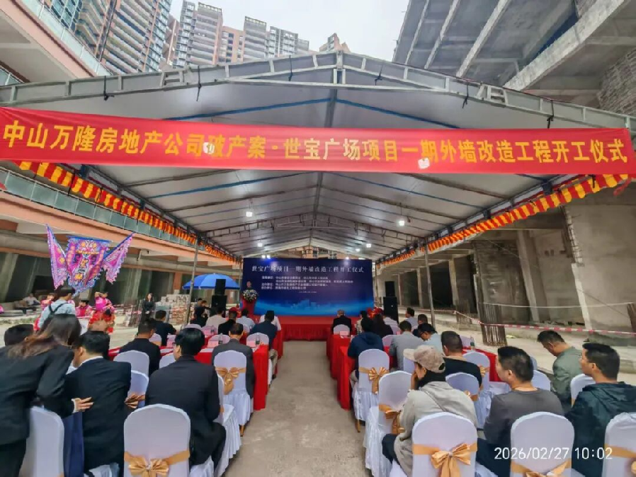 △中山市东凤镇世宝广场项目一期外墙改造工程正式动工 世宝广场项目一期于2014年开工建设,共涉及住宅及商铺929套。自2018年起,项目住宅楼外墙陆续出现墙砖空鼓、脱落现象,不仅严重危及群众生命财产安全,导致项目无法通过验收备案,更使业主陷入“有房难住、有证难办”的困境。2020年11月18日,针对开发商中山市万隆房地产开发有限公司资不抵债的现状,中山市中级人民法院依法裁定受理其破产案,并指定广东天地正律师事务所担任管理人。 面对这一复杂的“硬骨头”,中山市中级人民法院坚持法治化、市场化原则,联合市住建局、市自然资源局及东凤镇政府,深化“府院联动”机制,在法律框架内积极寻求破题之道,指导破产管理人团队依法履职,高效推进资产盘活与债权审查工作。据悉,管理人团队先后组织召开8次债权人会议及近百场协调会,逐一攻克了资产解封、资金筹措、施工许可等一系列棘手难题,并完成了小区供水管网、二次供水及消防系统工程的续建工作,为项目竣工验收按下了“加速键”。 此次启动的外墙续建工程是项目一期竣工备案的关键环节,工期预计200天,计划于2026年9月完工。开工仪式上,法院、东凤镇政府、破产管理人及施工单位一致表示,将严把材料采购与施工工艺关,强化全过程监管,确保将一期项目打造成为经得起时间检验的“民心工程”和“安居工程”。